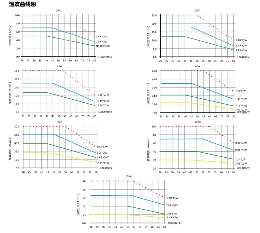 ◆工作电流10A以上的产品必须安装散热器,继电器与散热器之问加上导热硅脂才能良好散热,散热器表面温度接近60°C时应强迫风冷。